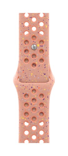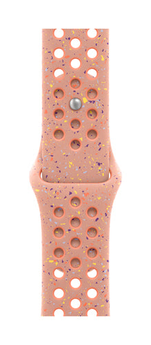 Made with compression-molded perforations for breathability, the Nike Sport Band is durable and strong, yet surprisingly soft. It features colorful flakes that create a randomized pattern, making each band unique. The smooth, dense material drapes elegantly across your wrist and feels comfortable next to your skin. An aluminum pin-and-tuck closure — carefully etched with the Run Swoosh logo — gives the pin a fresh matte finish.