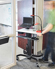 TeachWell easily rolls through aisles, doors and cramped media areas, while its height-adjustment platform moves the keyboard, display and worksurface in one simple motion. Change from a sitting to a standing position as you work whenever you want.