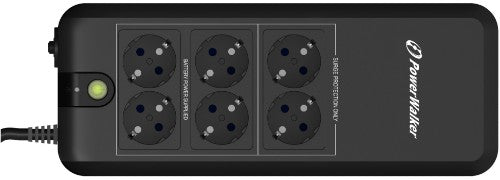 PowerWalker VFD APFC series is a standby/offline UPS for home and office applications and it is equipped with a technique that allows using the full power of UPS, even when used with APFC power supply load. Usually it is required to oversize a UPS to ensure secure backup when connecting a power supply with active power factor correction. With the implemented technology this is no longer needed. Therefore you can choose smaller cost-effective UPS (e.g. PowerWalker VFD APFC instead of usual offline or line interactive 1000 VA model). Besides the lower purchase price, it also saves energy cost due to lower own power consumption.Equipped with 6 Schuko-Type outlets (all with surge protection, 4 with battery backup) these models can be used like a power strip. A special battery compartment enables an easy exchange of the rechargeable battery by the user.