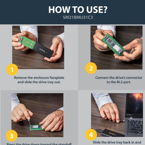 - Leverage your SATA M.2 SSD to add fast external storage to your USB-C enabled host (USB-C cable included)