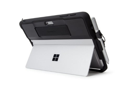 The BlackBelt™ Rugged Case for Surface Go surrounds the Surface Go in drop protection with an integrated hand strap for worry-free carrying. The Type Cover easily attaches and detaches without removing the protective case, and a form-fitting Surface Pen holder and tether keeps the pen handy. The BlackBelt Rugged Case’s strategic cut-outs preserve unobstructed access to the Surface Go’s kick stand, buttons, ports and camera.