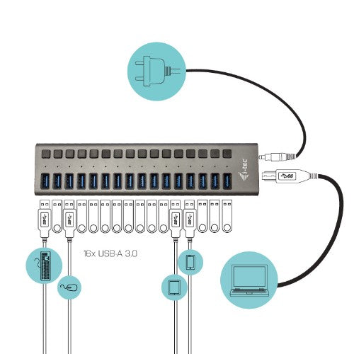 Long product description: i-tec USB 3.0 Charging HUB 16port with power adapter 90 W, 16x USB 3.0 charging port, ideal for laptop ultrabook tablet PC, Windows Mac Linux