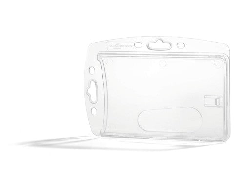 Proximity card holder with thumb slot for easy removal and replacement of the card. Can be used in either portrait or landscape format and can be combined with clip, chain, textile necklace or badge reel. Inside dimensions: 54 x 85 mm (H x W)