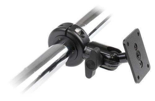 Heavy duty pipemount, ball mount. Swiveling mounting plate 50x42 mm with 4 mm AMPS holes. Fits round pipes 20-32 mm. Tilts 210°, rotates 360°.For strong installation of devices on pipes and rods/bars, for example most types of vehicles; motorcycles, boats, carts, stands, wheelchairs, airplanes etc. Made in aluminum. Color: black.