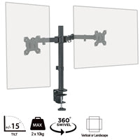Constructed of strong steel tubing, the piXL Dual Monitor Arm mounts two screens side by side to conveniently free up desk space. It holds two TVs or monitors up to 10kg each, compatible with VESA dimensions of 75x75mm or 100x100mm.