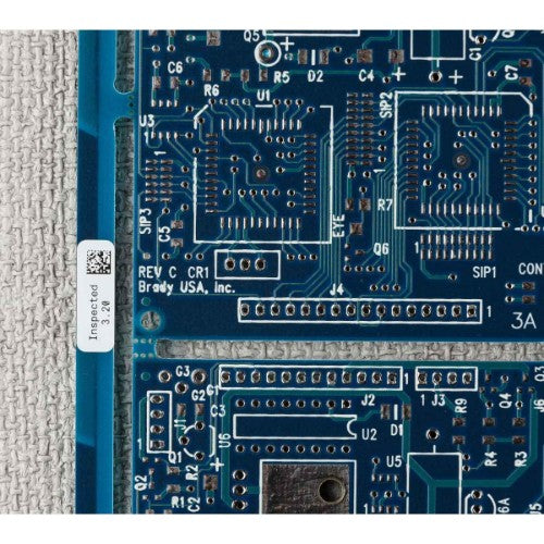 High Temperature Polyimide (B-727) withstands wave solder environments and multiple harsh washes for printed circuit board and electronic component preprocess labeling.