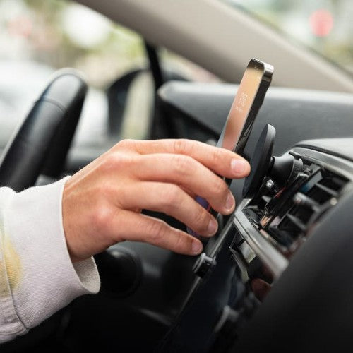 Keep your phone at the perfect viewing angle while you drive. mophie's snap vent mount uses a convenient magnetic array to hold your phone in place, so it's easy to make hands-free calls and follow GPS directions.