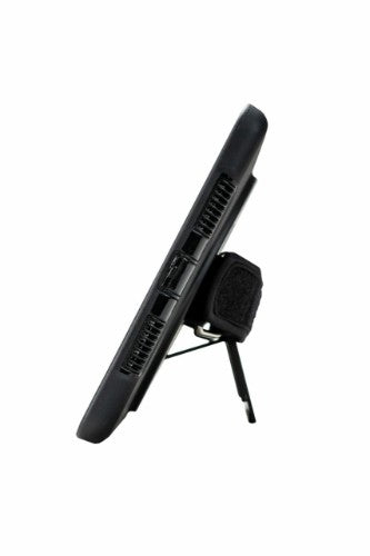 This protective tablet case keeps your iPad shielded from collisions and falls. Its durable, rugged frame gives you heavy-duty impact shielding without compromising on usability. An additional silicone jacket offers further protection for your device. The case is designed to allow full access to your iPad's ports, buttons, and jacks. This case is also outfitted with a resizable hand strap, plus a rotating 360 degree grip ring, giving you a comfortable handheld solution in portrait and landscape orientations. Also included is a foldout kickstand for fast, easy tabletop display options.