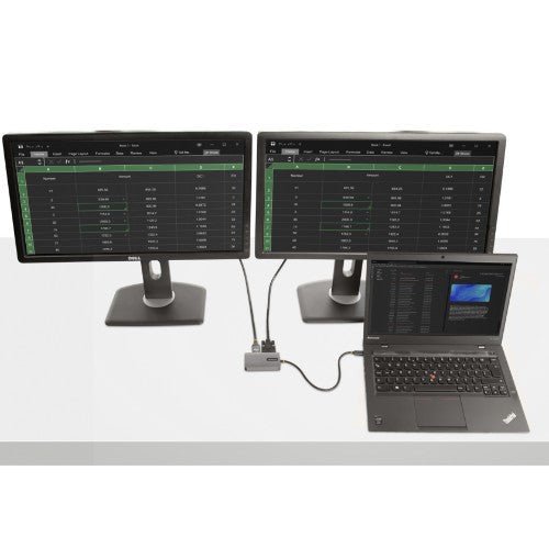 The HDMI 2.0b output supports up to 4K 60 Hz resolutions and HDR whereas VGA output supports up to 1920x1200 at 60 Hz, and the DVI-I output supports up to 1080p at 60 Hz. All the outputs offer compatibility with older displays supporting lower resolution. The adapter supports dual mirrored 1080p displays when using either VGA and HDMI or VGA and DVI-I monitor configurations.