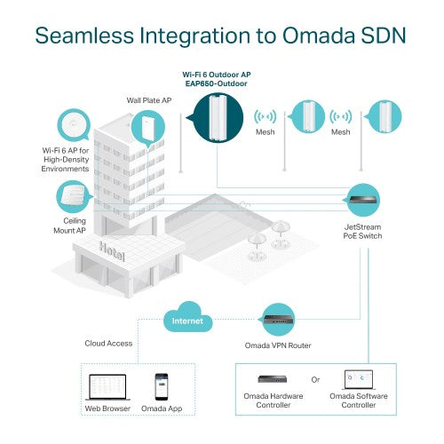 - Omada Mesh Technology: Enables wireless connectivity between access points for extended range and flexible deployment