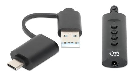 USB C and USB A to 3.5mm headphone jack adapter - connect your wired Aux headset to your phone, laptop or computer via USBThis active Manhattan USB Audio Adapter is a convenient 2-in-1 combo to connect your wired Aux device, such as a headset, headphones or speakers, to a USB device. Featuring a 3.5 mm audio jack on one end and two USB plugs on the other (Type-A and Type-C), it provides a versatile and affordable audio solution for your USB devices that do not have an aux input. Think of it as an external sound card, which means it can easily replace sound cards that no longer work and bypass damaged audio ports. As many desktop PCs have their headset jacks on the back and USB ports on the front, this will headphone jack adapter gives you better access to your audio connections.
