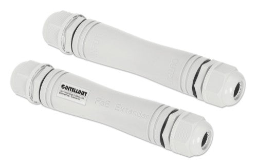 Ultra Long Distance Power over Ethernet Extension / Repeater / Amplifier for a PoE range up to 1,000 m (3,280 ft.) - even in harsh outdoor conditionsThe Intellinet Network Solutions Ultra Long Range Outdoor Fast Ethernet PoE+ Extender Kit adds up to 1,000 m (3,280 ft.) to the connection distance from a PoE source to an output device via Cat5e or Cat6 cable. It has an output power rating up to 30 watts, which is enough for many power-hungry PoE devices. Its high range and weatherproof housing is especially useful for outdoor IP surveillance camera deployments. This PoE repeater delivers up to 30 W at 100 Mbps over 300 m (984 ft.) or up to 15.4 W at 10 Mbps over 800 m (2625 ft.).