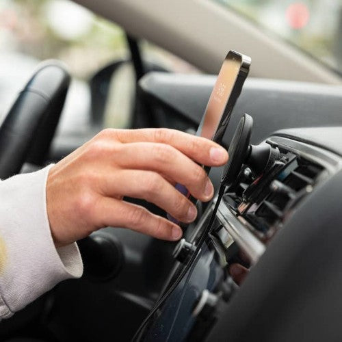 Easily charge while you drive! The snap+ wireless charging vent mount delivers up to 15W of power to your phone while holding it at the perfect viewing angle. The strong magnets secure your phone in place, making it easy to use for GPS navigation or hands‑free calling. The charging puck is also removable for added versatility. The snap+ wireless charging vent mount is also compatible with MagSafe for iPhone 12 models.