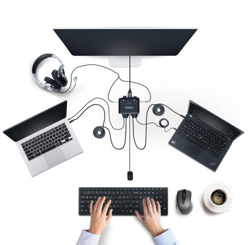 Share a mouse, keyboard, and 4K 60Hz DisplayPort display between two USB-C enabled laptops, using this KVM Switch with built-in cablesThis USB Type-C KVM Switch enables users to switch between two USB-C laptops, sharing a 4K 60Hz DisplayPort monitor, keyboard, mouse, and audio input/output devices.