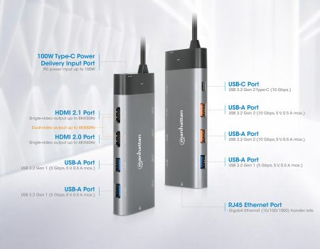 Laptop / MacBook® Docking Station for two HDMI monitors with Power Delivery charging plus Ethernet and USB connectionsIncrease your productivity with your PC, Mac® or tablet using this highly versatile docking station from Manhattan. It helps you multitask on two UHD HDMI monitors at the same time. You're also able to meet most connectivity needs with five SuperSpeed USB-A ports that connect and charge compatible devices fast, as well as a SuperSpeed USB-C data-transfer port to connect high-bandwidth devices. The included 10/100/1000 auto-sensing Ethernet port helps you onto your wired network, and the up-to-100-W Power Delivery (PD) input helps get power to all USB devices that connect to the dock.