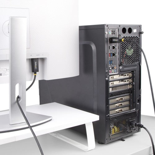 Integrated video adapter cable reduces points of failure, signal loss and clutter, and requires no additional power. Built with adaptive receiver equalization to optimize the input signal and amplify the output signal, to ensure display compatibility. Cage shielding prevents Electromagnetic Interference (EMI) and helps maintain signal integrity. This Active Adapter Cable works with computers from Dell, HP, Lenovo, and other desktop manufacturers. It is backward compatible with 4K 30Hz, 1080p, and other lower resolutions.
