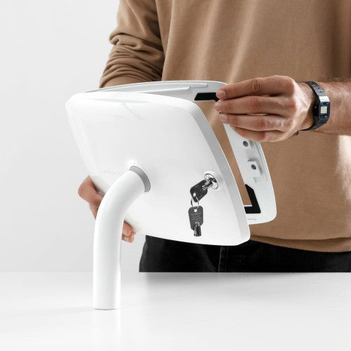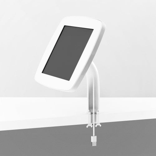 The Bouncepad Static 60 is a secure tablet kiosk ergonomically designed for easy interaction when mounted to a bar height counter, table or desk. This desk mounted enclosure is compatible with iPad, Samsung and Microsoft tablets. See detailed tech specs below.Focused angle