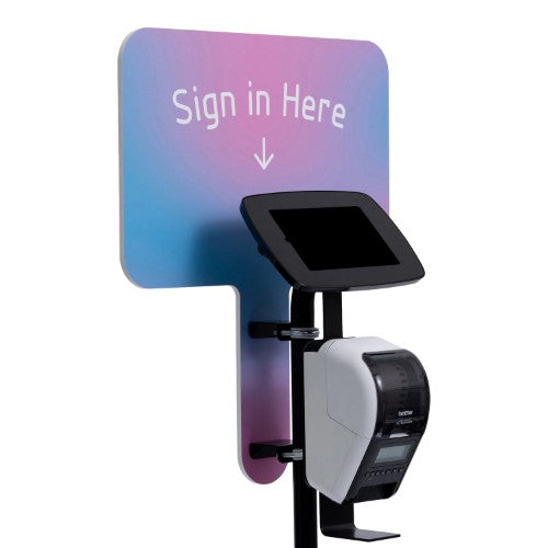 The Bouncepad Original Floorstanding + Brother ® Printer Mount + Placard Board is a secure tablet and iPad floor stand designed for visitor management.The printer mount secures the label printer with 4 screws (compatible with Brother ® QL-820-NWB, QL-820NWBc or QL-810W), manages the power cable and catches the label. It also retains access to the printer lid so you can change the paper reel when it runs out.
