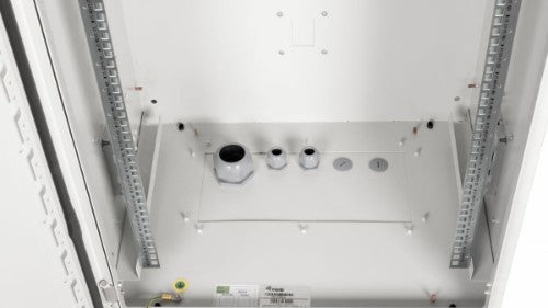 The "Safe Outdoor" Cabinet Line presents the 483 mm (19") IP55 Outdoor Wall Mount Cabinets, tailored for industrial use. Adhering to the IP55 safety standard as per EN 60529, they offer resistance against both water and dirt infiltration. Enhanced security is ensured with a 3-point-locking system complemented by a lockable swing handle and insulated cable entry points. The cabinets also feature integrated air ventilation slots for fresh air circulation, maintaining protection against water and dust as per IP54 standards. These cabinets are ideal for locations exposed to environmental elements like rain, dust, sleet, snow, and splashing water. For more flexibility, these cabinets can be paired with a plinth for standalone setups. When using the plinth, rear mounting holes can be sealed using plugs sourced from the cabinet's base.