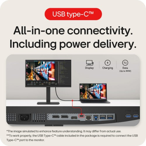 The USB Type-C™ port allows from display and data transferring to connected device charging (up to 90W), using a single cable. USB Type-C™ cable included.