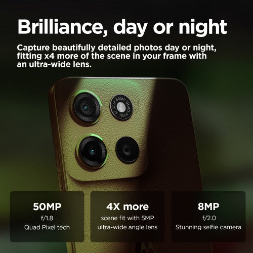 moto g15 brings you cinematic entertainment at its best. Watch your favourite programmes and films come to life on a super sharp and bright 6.72” Full HD+ display – even outdoors in sunlight. Listen to sound all around thanks to powerful stereo speakers with bass boost and Dolby Atmos®. Capture beautifully detailed photos with the 50 MP(1) camera system, eliminating those annoying bars from artificial light sources. Fuel up fast with TurboPower™ charging(2) then go for longer with a 5200 mAh battery. Enjoy the premium look and feel of vegan leather, along with the protection of a water-repellent design(3) and Corning® Gorilla® Glass 3. Plus, experience fast performance and plenty of storage, so there’s always room for fun. Brighten each day with moto g15.