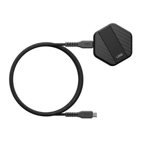 Experience quick and hassle-free magnetic charging with the UAG wireless charging pad. Integrated magnets that align perfectly to deliver charging speeds up to 15 Watts. With MagSafe™ case compatibility you can conveniently charge your device without removing your protective case. The integrated metal kickstand allows for hands-free viewing while your device powers up so you can catch up on your favorite shows or keep an eye on notifications. Crafted for durability, the rugged construction features a metal alloy housing, a lightweight carbon fiber inlay, and a high-strength braided cable. Power up with ease with the UAG wireless charging pad.