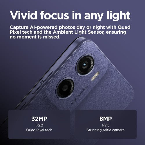 Brighten your entertainmentGive your entertainment a boost of brilliance with the new moto e15. Watch your favourite programmes and films on a super-bright 6.67" 90 Hz(8) display – even outdoors in sunlight. And listen to sound all around thanks to powerful stereo speakers with bass boost. Capture beautifully sharp photos day or night with the AI-powered 32 MP(2) Quad Pixel camera. Hit the accelerator with fast, efficient performance and up to 6GB(5) available RAM with RAM boost(4). With a vegan leather finish, water-repellent design(3) and Corning® Gorilla® Glass 3, moto e15 gives you style that lasts. Plus, keep the fun going non stop with a long-lasting 5200 mAh battery and TurboPower™ charging. Make every day brighter with moto e15.