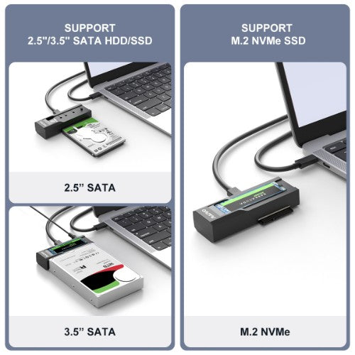 Compatible for different kinds of HDD/SSD in the market, including M-key NVMe SSD,2.5" SATA HDD/SSD and 3.5" SATA HDD, can recognize two disks simultaneously when connecting with PC