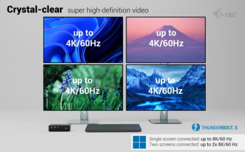 Extreme performance, ultra-fast data transfer, and support for resolutions up to 8K/60 Hz. The most powerful i-tec docking station on the market!Crystal-clear image quality, lightning-fast internet, and data transfer speeds of up to 12 GB per second thanks to the integrated Thunderbolt 5 output port. Of course, you can also connect headphones or audio devices and charge your laptop (up to 140 W**) – all through a single cable (a 100 cm certified Thunderbolt 5 cable is included in the package).