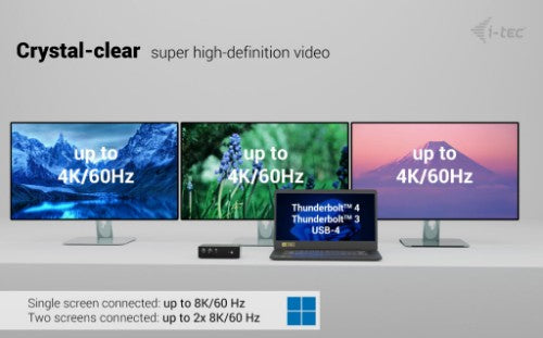With Thunderbolt 5 and Windows laptops, you can connect up to four monitors (the laptop lid must be closed). With Apple laptops running macOS, a maximum of two external monitors is supported.