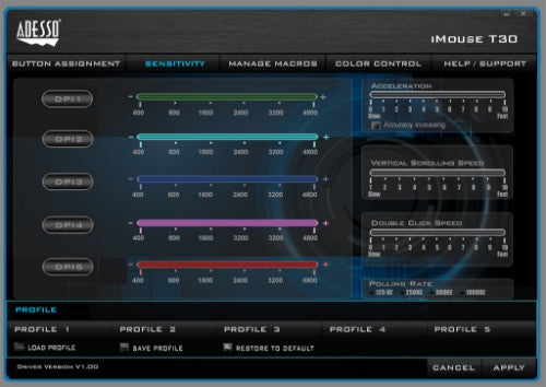 Meet one of the newest models of the Adesso Trackball product line, the Adesso iMouse™ T30. It incorporates the palm grip design where each user can rests his entire hand over the mouse. This design encourages users to move their cursor by rotating the track ball using their thumb and reduces the need of hand movement. It is cable-free by utilizing the 2.4 GHz radio frequency technology, offering a wireless range of up to 30 feet. It’s also fully programmable, meaning every mouse button can be customized to your preferred function with its programmable driver. With its 5 levels of DPI resolutions (400-4800), the optical trackball provides superior accuracy and smooth motion, reducing hand movement and space. This mouse trackball is also easy to maintain – just push the trackball outward from its back, clean it and push it back in place. Its ergonomically contoured large size trackballfurther complete its ergonomic advantages, making your daily computing tasks more comfortable and stress-free.