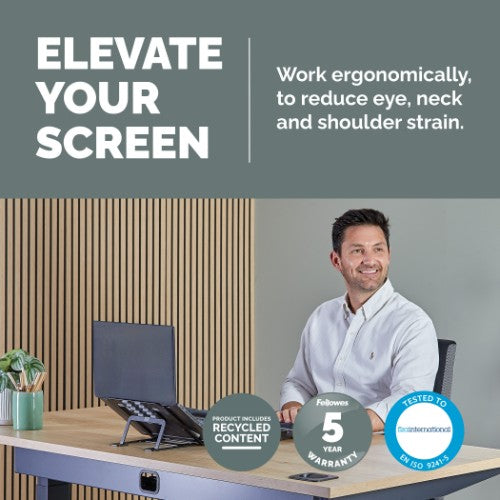 - MINIMISE DISCOMFORT - Help minimise discomfort in your workspace by placing your laptop at a more ergonomically correct viewing position to suit you with the Fellowes Alumia Portable laptop stand, relieving any neck and eye strain