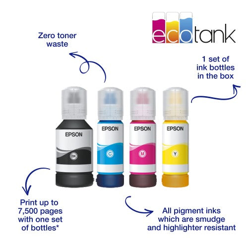 - Simple hassle-free ink tank system lets you refill from bottles: Plus the EcoTank key-lock bottle system ensures it's mess-free too
