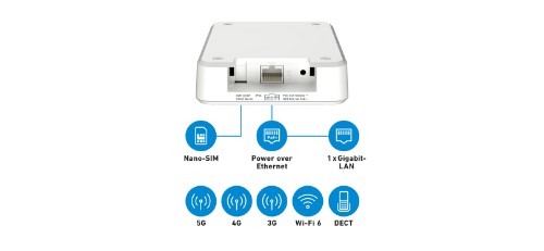 Wi-Fi 6 2x2 MIMO, 5G nano-SIM, DECT, VoLTE/VoNR, Gigabit LAN, PoE+, IP54