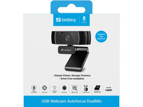 Sandberg USB Webcam Autofocus DualMic offers you a sharp and clear picture thanks to the Full HD 1080P resolution. The lens features auto focus and automatic light adjusting, so that the counterpart can always see you clearly. A small embedded cover lets you cover the lens when you want to ensure your privacy. The camera sits on a clamp to attach the camera easily on a laptop screen and the like. Finally, the camera features also stereo microphone.